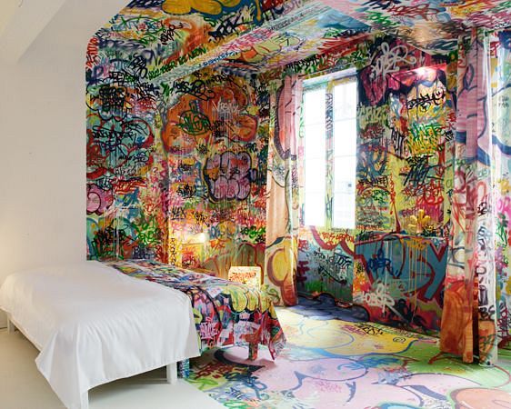 Panikas istaba viesnīcā Au Vieux Panier Hotel, kas atrodas Marseļā, Francijā. Šo šizofrēniskā rakstura dizainu izstrādājis mākslinieks Tilt.
