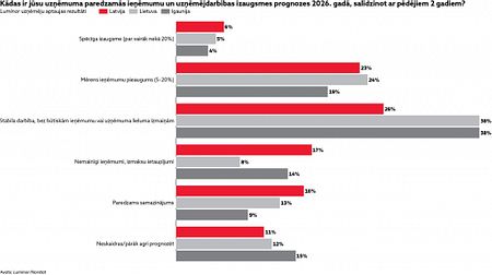 Līdzīgi ir Igaunijā, kur globālās ekonomikas uzlabošanos šobrīd saskata 49% vadītāju, kamēr 2023.gadā tie bija 14%, savukārt Lietuvā optimisma pieaugums bijis mērenāks - šogad par pieaugumu ir pārliecināti 27% vadītāju, kamēr 2023.gadā tie bija 24%.