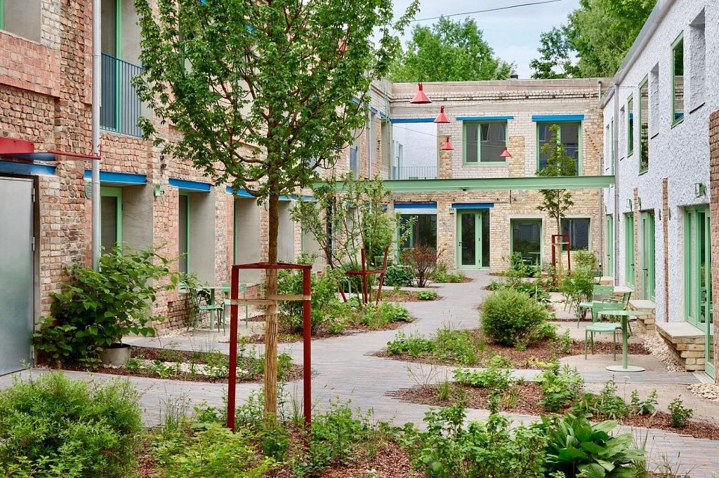 Pagalma ēkās atradās tipogrāfija, bijušas noliktavas, naktsklubs. “Šajā gadījumā funkciju izmaiņa ir būtiska un pārbūve notika pamatīgi. Iznākumā ir izveidoti dzīvokļu lofti ar lieliem logiem, terasēm pie ārdurvīm,” sacīja M. Duburs, piebilstot, ka apdare pagalma ēkās bijusi drosmīgāka.“Šo par savu dzīvesvietu ir izvēlējušies daudzi radošo profesiju pārstāvji. Tur veidojas sava veida kopiena. Es domāju, ka priekšnoteikums tam ir ārtelpa. Ir plaši logi, kas dod iespēju iegūt saikni ar ārtelpu. Visur ir platas palodzes, uz kurām var apsēsties. Ārpusē ir terases, kurām par paraugu ņemti Luksemburgas dārzi Parīzē. Tiešām, no turienes paņēmām āra mēbeļu metus. Ir arī neliela improvizēta siltumnīca, kur var nolikt savus telpaugus ziemošanai. Kazi, kāds vēlas nodarboties ar urbāno dārzkopību,” pauž M. Duburs.