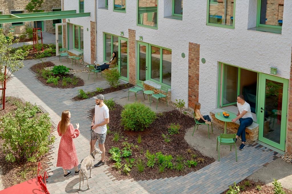 Ir daudz velonovietņu, tās ir gan pagalmā, gan pagrabā. Turpat netālu no nama ir veloceliņš, un tas ir mūsu kā attīstītāju aicinājums – vairāk izmantot velosipēdus. “Manuprāt, tas ir svarīgi jau nama attīstības fāzē - automašīnas neizvirzīt kā prioritāti. Bija šī vīzija, un bija atrasts arhitektu birojs, ar kuru sakrita domāšana – pagalmu izveidot par dārzu. Izveidojās arī veiksmīga sadarbība ar ainavu arhitektu biroju Alps, kas radīja ārtelpas plānojumu, un iznāca šis skaistais dārzs,” tā M. Duburs. Jāpiebilst, ka īpaši no Kurzemes pamestajiem dārziem uz pagalmu ir pārvesti vairāki ērkšķogu un jāņogu krūmi, kuri te ieguvuši otro dzīvi un dos ražu iedzīvotājiem. Ir izveidota lietus ūdens novadīšanas sistēma ar atklātām noteku baļļām, kas ne tikai dod vizuālu baudījumu lietus laikā, bet arī ūdens apjomu augu laistīšanai.