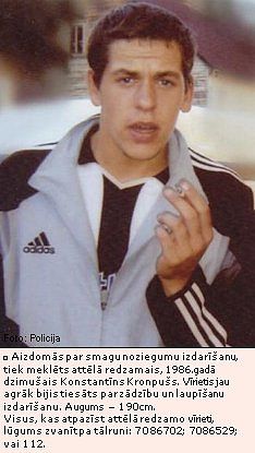Aizdomās par smagu noziegumu izdarīšanu, tiek meklēts attēlā redzamais, 1986.gadā dzimušais Konstantīns Kronpušs. Vīrietis jau agrāk bijis tiesāts par zādzību un laupīšanu izdarīšanu. Augums – 190cm.