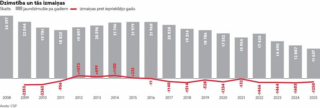 2025. gadā piedzima 11 637 bērni, kas ir par 1250 jaundzimušajiem jeb 9,7% mazāk nekā 2024. gadā. 2008. gadā kopumā piedzima 24397 mazuļi, kas ir aptuveni divas reizes vairāk nekā pērn. Vienlaikus jāpiebilst, ka tieši šogad 2008. gadā dzimušie sasniedz 18 gadu vecumu. Tieši šīs krīzes bērni dosies uz augstskolām, meklēs darbu, dzīvesvietu un, ja viss notiks kā līdz šim, aptuveni 20% no viņiem pametīs Latviju tuvāko desmit gadu laikā, tas veidos kārtējo dzimstības kritumu vēl pēc 10 gadiem.