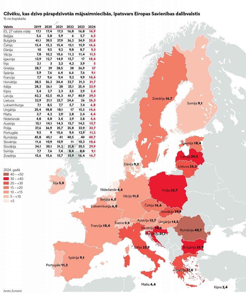 Eurostat datus par mājsaimniecību apdzīvotību visās valstīs apkopojusi 2025. gada decembra beigās, un pagaidām vienīgā valsts, kas iesniegusi datus par 2025. gadu, bija Igaunija. Šajā valstī demogrāfiskā situācija ir stabilizēta, bet pēdējo piecu gadu laikā pārapdzīvotības procents audzis par 4,5 procentpunktiem. Savukārt 2025. gadā Igaunijas pārapdzīvotības procents ir sarucis par 0,5% procentpunktiem. Proti, valstij izdodas sabalansēt jauno ģimeņu vajadzības ar platības piedāvājumu. 2024. gadā Latvijā 39,3% iedzīvotāju dzīvoja pārapdzīvotās mājsaimniecībās, kas ir aptuveni divas reizes vairāk nekā Igaunijā un par trešdaļu vairāk nekā Lietuvā. Rumānija ir vienīgā valsts, kas pēc pārapdzīvotības rādītāja apsteidz Latviju. Te gan jāpiebilst, ka kopš 2019. gada Rumānijā cilvēku skaits, kas dzīvo pārapdzīvotās mājsaimniecībās, ir sarucis par 5,1 procentpunktu. Proti, krietni straujāk nekā Latvijā.