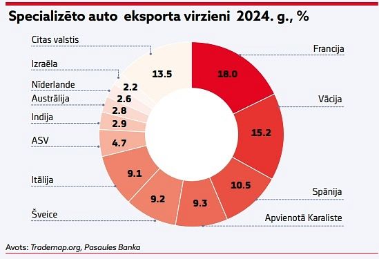 Latvijas specializēto auto eksporta galvenie virzieni 2024. gadā bija Francija (18% no Latvijas kopējā eksporta), Vācija (15,2% no Latvijas kopējā eksporta) un Spānija (10,5% no Latvijas kopējā eksporta). Nozīmīgs Latvijas specializēto auto eksports 2024. gadā bija arī uz Apvienoto Karalisti (9,3%), Šveici (9,2%), Itāliju (9,1%), ASV (4,7%), Indiju (2,9%), Austrāliju (2,8%), Nīderlandi (2,6%) un Izraēlu (2,2%), kā arī uz Norvēģiju, Maltu, Zviedriju, Īriju, Rumāniju, Portugāli, Somiju, Čehiju un Luksemburgu. Tādējādi secināms, ka Latvijas autobūves tradīcijas ir atjaunojušās un mūsu valsts var gūt izcilus panākumus eksportā, ražojot nevis sērijveida masveida produkciju, bet specializējoties nišas produktu ražošanā, tādējādi apmierinot pieprasījumu pēc īpašām vajadzībām būvētiem auto, kuri ir jāražo nelielos apjomos.