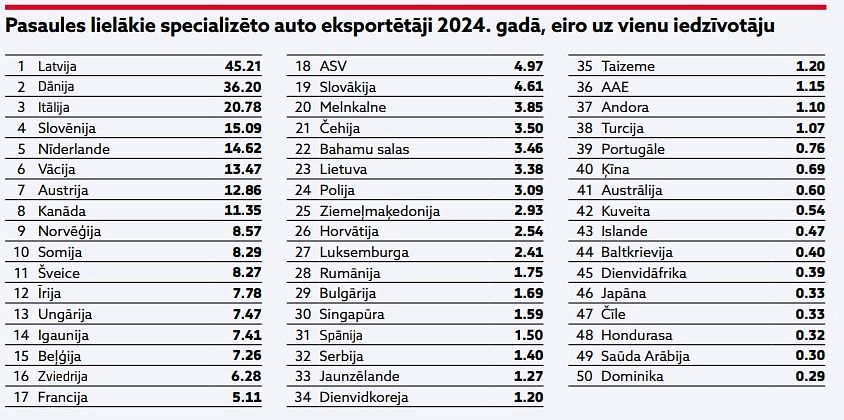 Lietuva ar 9,8 miljoniem eiro (0,12% no pasaules eksporta tirgus) bija 37. vietā pasaulē. Pēc ienākumiem no specializēto auto tirdzniecības uz vienu iedzīvotāju 2024. gadā Latvija ar 45,2 eiro uz vienu iedzīvotāju bija pirmajā vietā pasaulē. Otrajā vietā bija Dānija (36,2 eiro uz vienu iedzīvotāju), trešajā vietā – Itālija (20,8 eiro uz vienu iedzīvotāju), bet ceturtajā vietā – Slovēnija (15,1 eiro uz vienu iedzīvotāju). Pasaules lielāko desmitniekā vēl iekļuva Nīderlande (14,6 eiro uz vienu iedzīvotāju), Vācija (13,5 eiro uz vienu iedzīvotāju), Austrija (12,9 eiro uz vienu iedzīvotāju), Kanāda (11,3 eiro uz vienu iedzīvotāju), Norvēģija (8,6 eiro uz vienu iedzīvotāju) un Somija (8,3 eiro uz vienu iedzīvotāju). Igaunija ar 7,4 eiro uz vienu iedzīvotāju bija 16. vietā pasaulē, bet Lietuva (3,4 eiro uz vienu iedzīvotāju) – 23. vietā pasaulē.