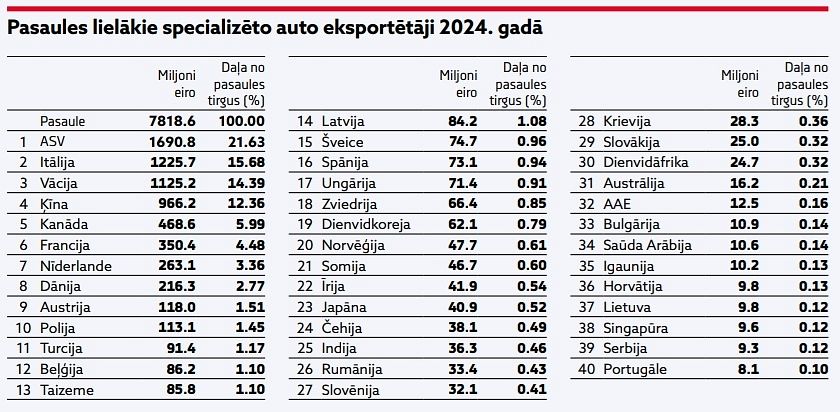 Pasaules lielāko specializēto auto eksportētāju desmitniekā vēl iekļuva Ķīna – 966 miljoni eiro (12,4% no pasaules eksporta tirgus), Kanāda – 469 miljoni eiro (6% no pasaules eksporta tirgus), Francija – 350 miljoni eiro (4,5% no pasaules eksporta tirgus), Nīderlande – 263 miljoni eiro (3,4% no pasaules eksporta tirgus), Dānija – 216 miljoni eiro (2,8% no pasaules eksporta tirgus), Austrija – 118 miljoni eiro (1,5% no pasaules eksporta tirgus) un Polija – 113 miljoni eiro (1,45% no pasaules eksporta tirgus). Latvija ar 84 miljoniem eiro (1,08% no pasaules eksporta tirgus) bija 14. vietā pasaulē. Latviju tikai nedaudz apsteidza Turcija (91 miljons eiro un 1,17% no pasaules eksporta tirgus), Beļģija (86 miljoni eiro un 1,1% no pasaules eksporta tirgus) un Taizeme (86 miljoni eiro un 1,1% no pasaules eksporta tirgus). 15. vietā pasaulē bija Šveice – 75 miljoni eiro (0,96% no pasaules eksporta tirgus). Igaunija ar 10,2 miljoniem eiro (0,13% no pasaules tirgus) bija 35. vietā pasaulē.