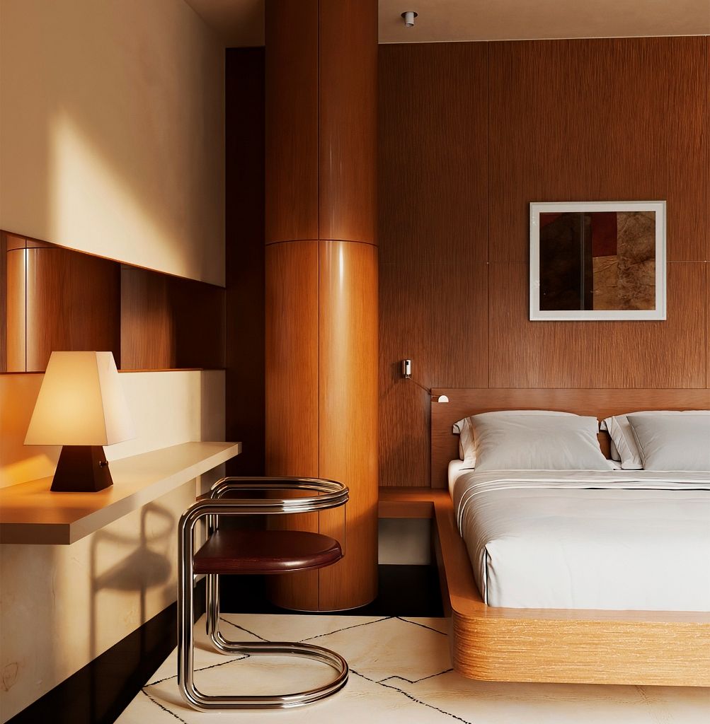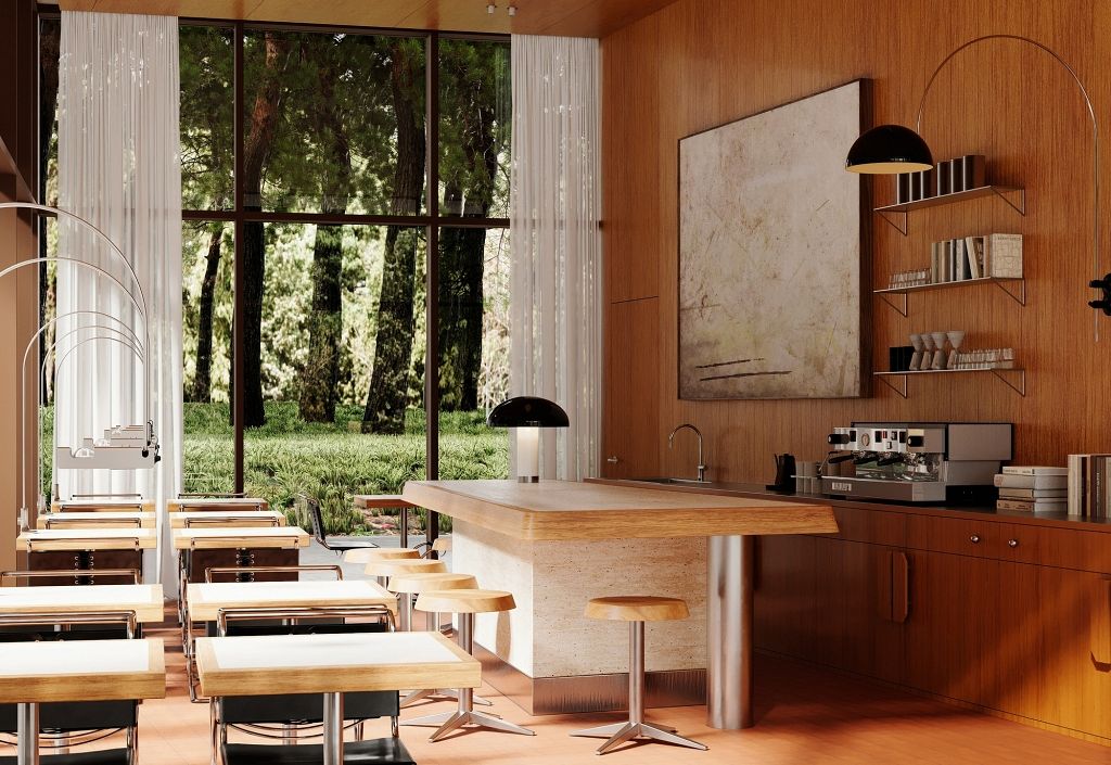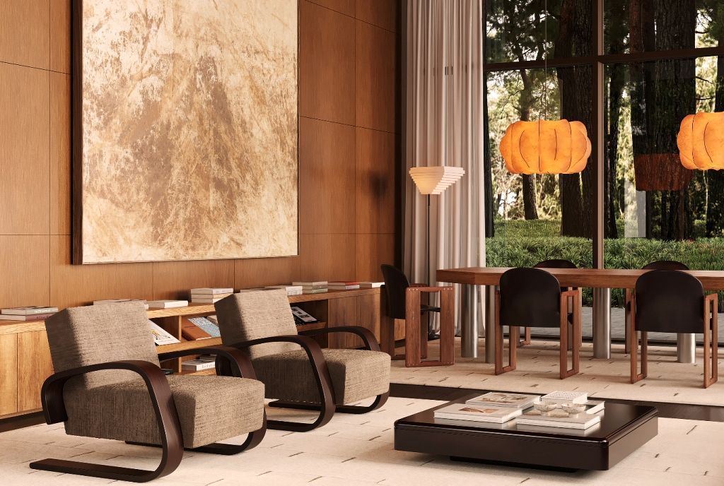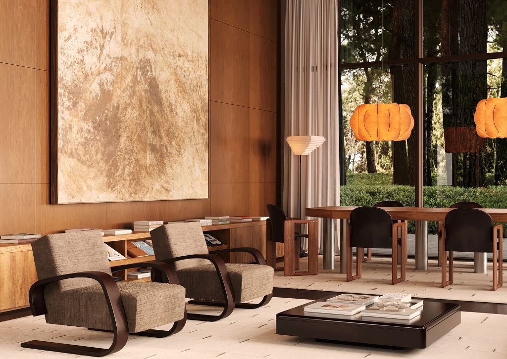 Interjerā iemiesota leģendārā arhitekta Frenka Loida Raita (Frank Lloyd Wright) ideja par arhitektūras, interjera un mēbeļu vienotību – dizains ir elastīgs, cilvēkcentrēts un cieši saistīts ar dabu, veicinot mierpilnu dzīves vidi un apzinātas attiecības ar apkārtējo ainavu. Estētiskā iedvesma projektā definēta kā 1970. gadu Kalifornijas modernisms, kas šeit pārtulkots laikmetīgā, ziemeļnieciskā valodā.