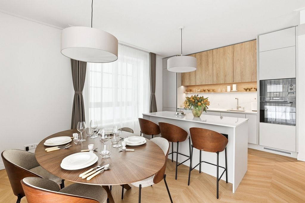 Paralēli būvdarbiem tiek īstenoti apdares risinājumi ar uzsvaru uz ilgmūžīgiem, laikmetīgiem materiāliem un izpildījuma kvalitāti: ēku fasādēs paredzēts dabīgais akmens un profilēti koka paneļi akcentu zonās, publiskajās telpās – travertīns, koka paneļi un flīzes, bet dzīvokļos – ozola parkets, dabīgs akmens vannasistabās un slēdži no nerūsējošā tērauda.