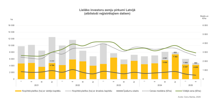 Salīdzinājumam - 2024. gadā kopējais lielāko investoru darījumu apjoms Latvijā (vietējais un ārvalstu kapitāls kopā) bija 30 149 ha (2977 darījumi), kas nozīmē, ka šis viens darījums pārspēj 2024.gada apjomu vairāk nekā četras reizes vai līdzvērtīgs 160% no visiem darījumiem ar zemēm Latvijā 2024.gadā.