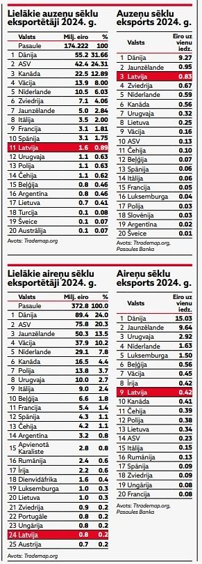 Vislielākie ienākumi no auzeņu sēklu eksporta, rēķinot uz vienu iedzīvotāju, 2024. gadā bija Dānijai (9,3 eiro uz vienu iedzīvotāju). Otrajā vietā bija Jaunzēlande (0,95 eiro uz vienu iedzīvotāju), trešajā vietā – Latvija (0,83 eiro uz vienu iedzīvotāju). Lietuva ar 0,25 eiro uz vienu iedzīvotāju bija 8. vietā pasaulē. Latvijas ienākumi no aireņu sēklu eksporta nav tik lieli kā no auzeņu sēklu eksporta, tomēr tie ir nozīmīgi. 2024. gadā vislielākos ienākumus no aireņu sēklu eksporta guva Dānija – 89 miljonus eiro (24% no pasaules kopējā eksporta). Otrajā vietā pasaulē bija ASV – (76 miljoni eiro un 20,3% no pasaules kopējā eksporta), trešajā vietā – Jaunzēlande (50 miljoni eiro un 13,5% no pasaules kopējā eksporta). Lietuva ar vienu miljonu eiro (0,26% no pasaules kopējā eksporta) bija 20. vietā pasaulē, savukārt Latvija ar 0,8 miljoniem eiro (0,21% no pasaules kopējā eksporta) – 24. vietā pasaulē.