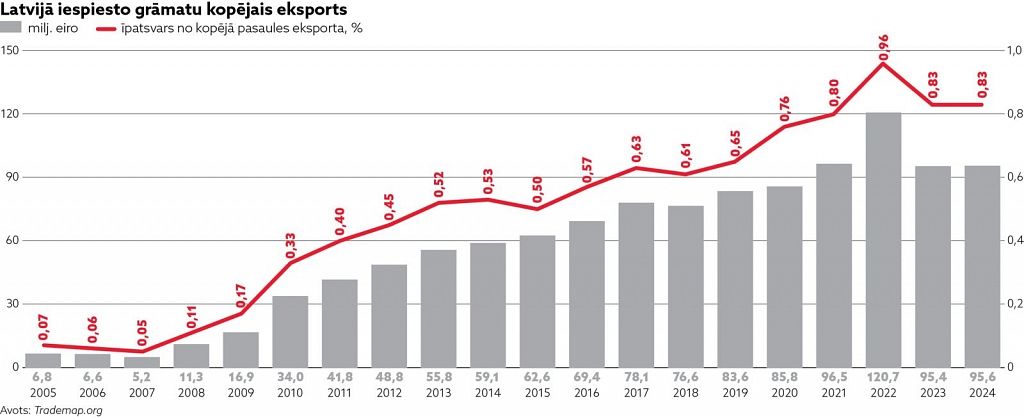 Tā var teikt šā raksta virsrakstā, nedaudz pārveidojot bērnu dzejnieka Pētera Sila (1908–1953) jau folklorizējušās rindas no dzejoļa “Uz skolu”, jo 2024. gadā Latvija bija pasaules līdere grāmatu eksportā uz vienu iedzīvotāju un galvenais Latvijā iespiesto grāmatu eksporta tirgus bija Eiropas valstis – Vācija, Zviedrija un Norvēgija.Kā liecina Starptautiskā Tirdzniecības centra International Trade Center apkopotā statistika (ITC atbalsta ANO Tirdzniecības un attīstības aģentūra, Eiropas Savienība un Pasaules Tirdzniecības organizācija), 2024. gadā Latvija, rēķinot uz vienu iedzīvotāju, bija pirmajā vietā pasaulē pēc ienākumiem no poligrāfijas produkcijas – grāmatu eksporta.Poligrāfija un papīra ražošana ir nozīmīga Latvijas rūpniecības nozare.