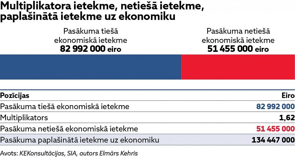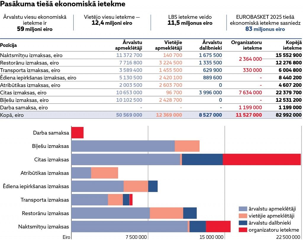 Eiropas basketbola čempionāta tiešā ietekme uz Latvijas ekonomiku bija 82,99 miljonu eiro apmērā, bet netiešā – 51,45 miljoni eiro, liecina Elmāra Kehra izstrādātais turnīra ekonomiskās ietekmes ziņojums.