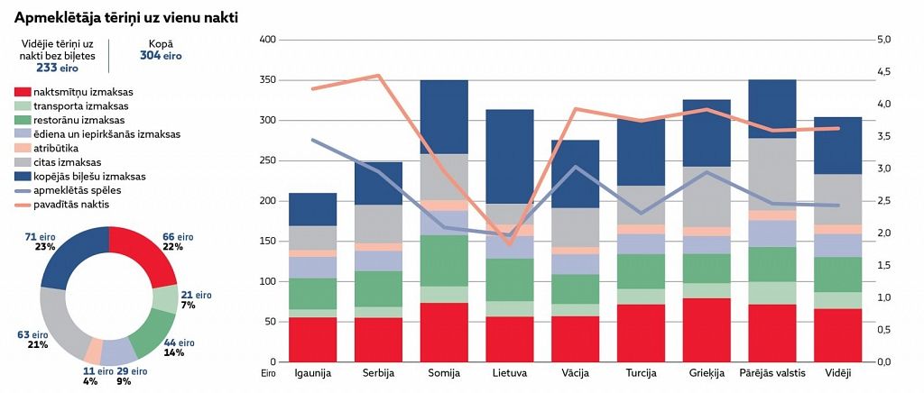 Vidējie tēriņi ārvalstniekam uz nakti bez biļešu izmaksām bijuši 233 eiro, bet ar ieejas biļeti uz spēli – 304 eiro. No tiem 22% jeb 66 eiro atvēlēti naktsmītnei, 44 eiro – restorāniem, 29 eiro – ēdiena iepirkšanai, 21 eiro – transporta izmaksām, 11 eiro – atribūtikai, bet citās izmaksās iztērēti 63 eiro. Šeit visvairāk esot tērējušies somi, kuriem viena diena Rīgā kopā ar spēles apmeklēšanu izmaksājusi ap 350 eiro. Savukārt igauņi dzīvojuši visaskētiskāk, iztērējot nedaudz virs 200 eiro dienā.