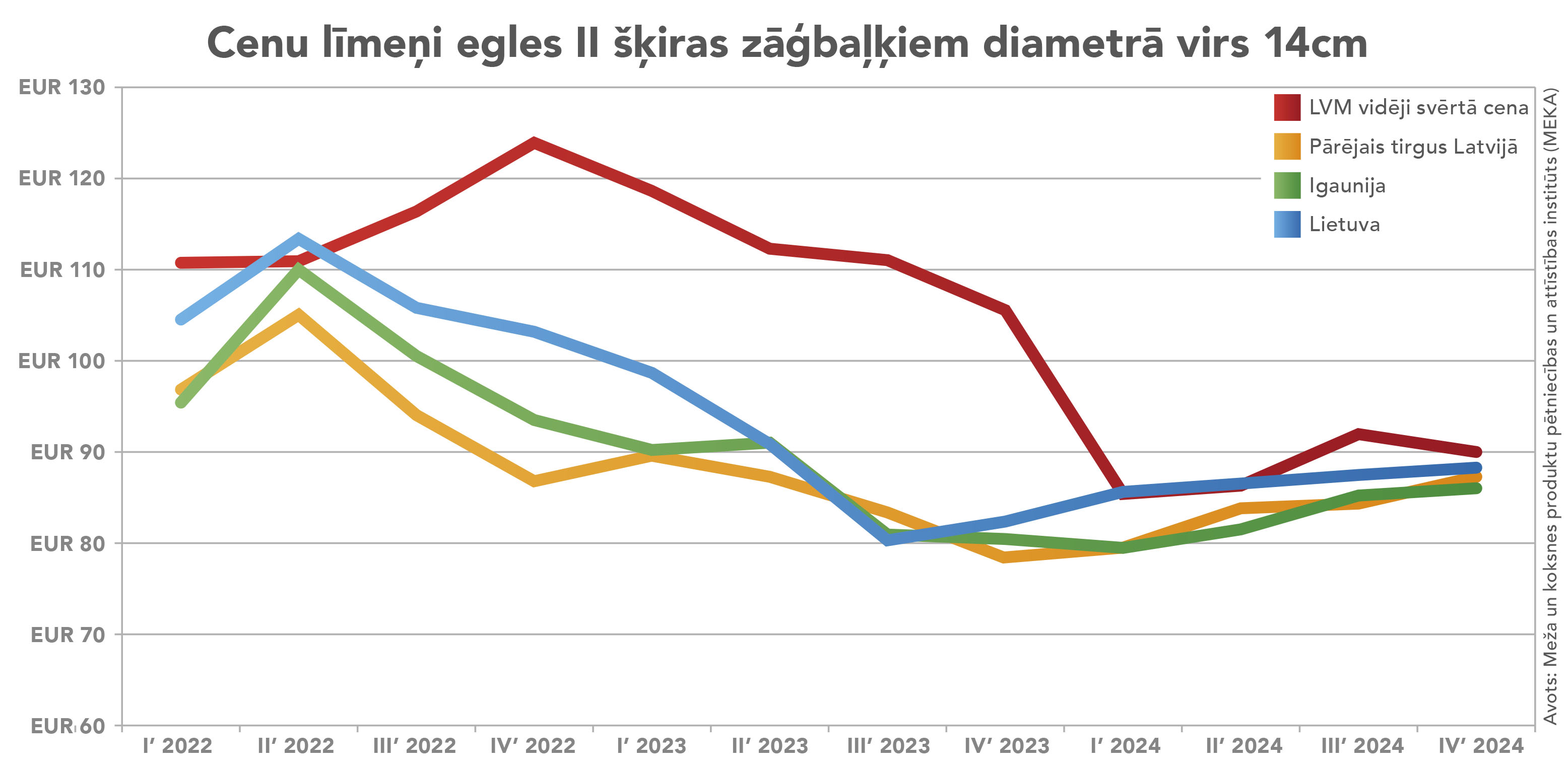 Savukārt 2022. gada IV ceturksnī priedes zāģbaļķu cena pie pircēja Latvijā no LVM bija 126 eiro/m³, no Lietuvas valsts mežiem 112 eiro/m³, no Igaunijas valsts mežiem – 132 eiro/m³, bet Zviedrijā – 75 eiro/m³, 2023. gada II ceturksnī Latvijā no LVM bija 119 eiro/m³, no Lietuvas valsts mežiem 95 eiro/m³, no Igaunijas valsts mežiem – 103 eiro/m³, bet Zviedrijā – 74 eiro/m³.Īsāk sakot, no 2022. gada II ceturkšņa skujkoku zāģbaļķu piegāžu līgumi no ilgāka termiņa sadarbības programmas zaudēja konkurētspēju, jo bija ir par 40% dārgāki nekā galvenajā konkurentvalstī – Zviedrijā. Skujoku pārstrādātāji Latvijā nevarēja klusēt un neko nedarīt, tāpēc jau 2023. gada oktobrī tika rakstītas vēstules, skaidrojot problēmu un aicinot meklēt risinājumu.
